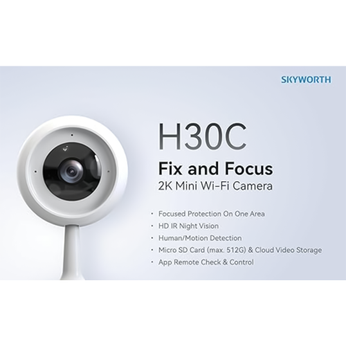 كاميرا Skyworth H30C هي كاميرا مراقبة داخلية ذكية بدقة 3 ميجابكسل (1920p)، مصممة لتوفير رؤية واضحة ومراقبة فعّالة داخل المنازل والمكاتب والأماكن المغلقة.