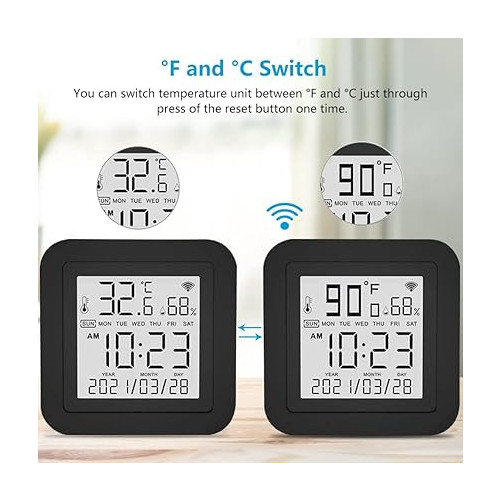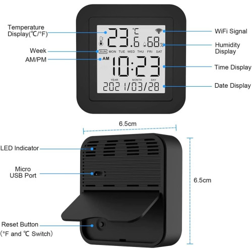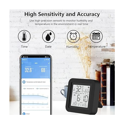 The device features a built-in display that shows real-time temperature and humidity readings, making it easy to monitor environmental conditions. It integrates seamlessly into smart home systems and can be controlled via a mobile app.